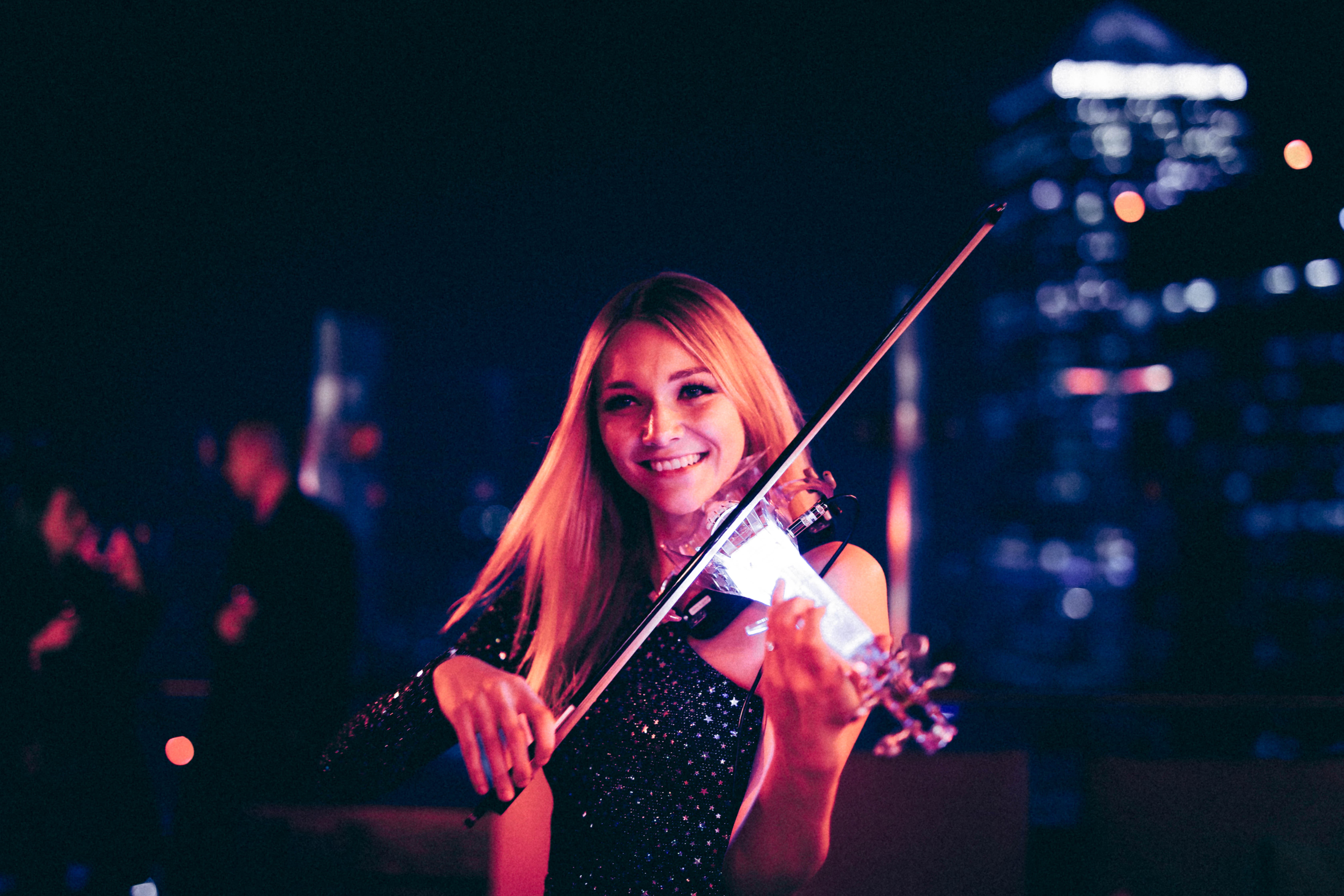 She plays electric violin in London, throughout the UK, and around the world as a soloist, as well as with other musicians in live acts that include Entourage, House Of Angels and Lumina the Laser Violinist.