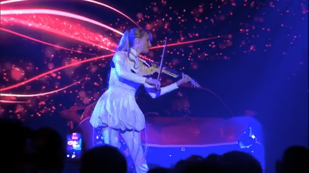 Alongside her beautifully illuminated instrument, Angeline can also wear outstanding fibre optical dresses, that when lit up create beautiful patterns across the stage.